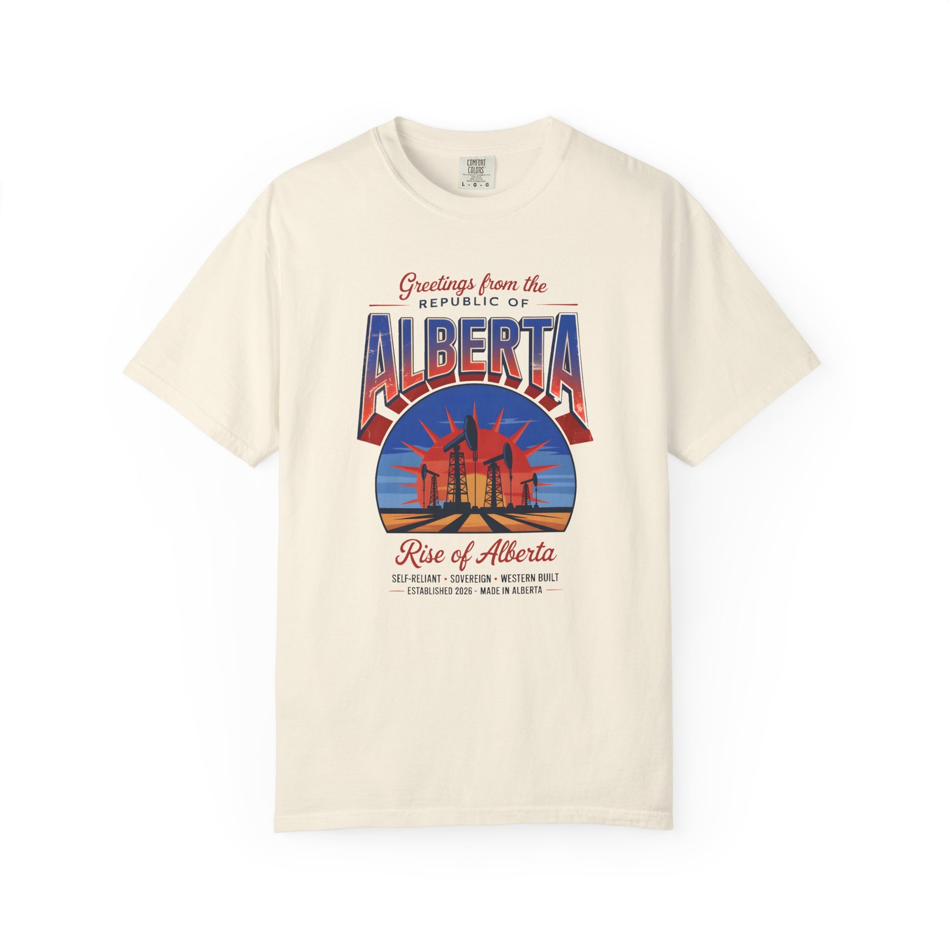 Send a message without saying a word. The “Greetings from the Republic of Alberta” Vintage Style T-Shirt channels old-school charm with a bold new vision — a free Alberta standing tall. Featuring a throwback graphic design and soft, garment-dyed cotton, this tee looks like a postcard from the future: one where Alberta leads itself.